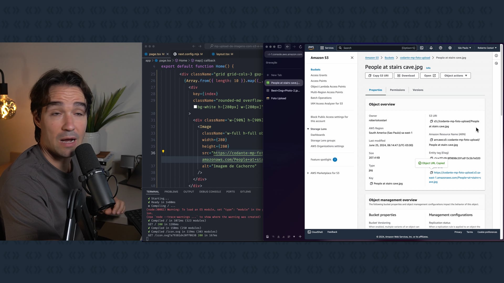 Adicionamos acesso programático ao nosso bucket S3 criando um usuário IAM. Configuramos permissões específicas para o bucket e obtivemos as Access Keys, armazenando-as em um arquivo .env.local no projeto.