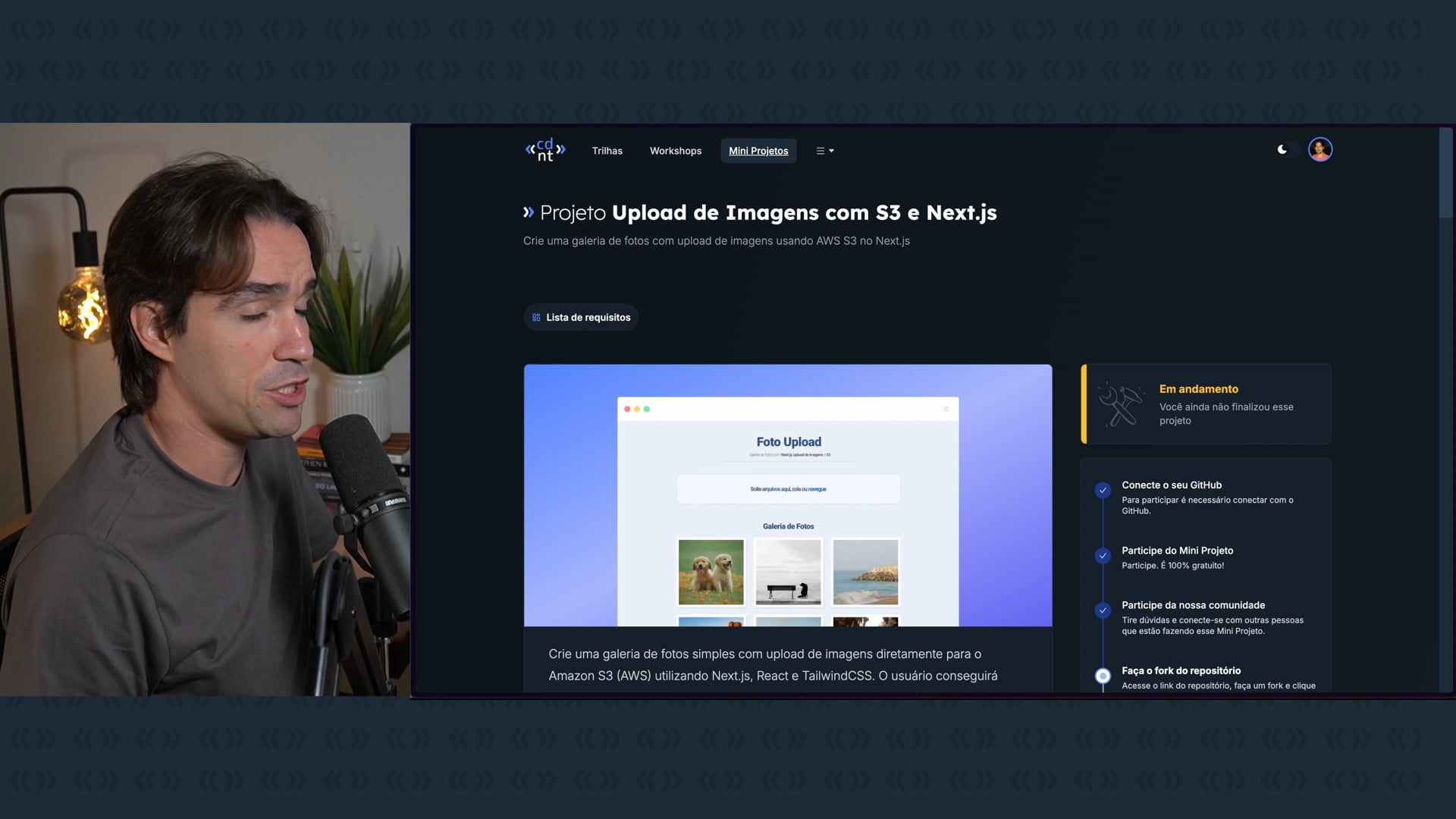 Iniciamos a configuração do projeto de upload de imagens com Next.js. Fizemos um fork do repositório, clonamos o projeto, e instalamos uma nova aplicação Next.js. Limpamos arquivos desnecessários e adicionamos um favicon personalizado.