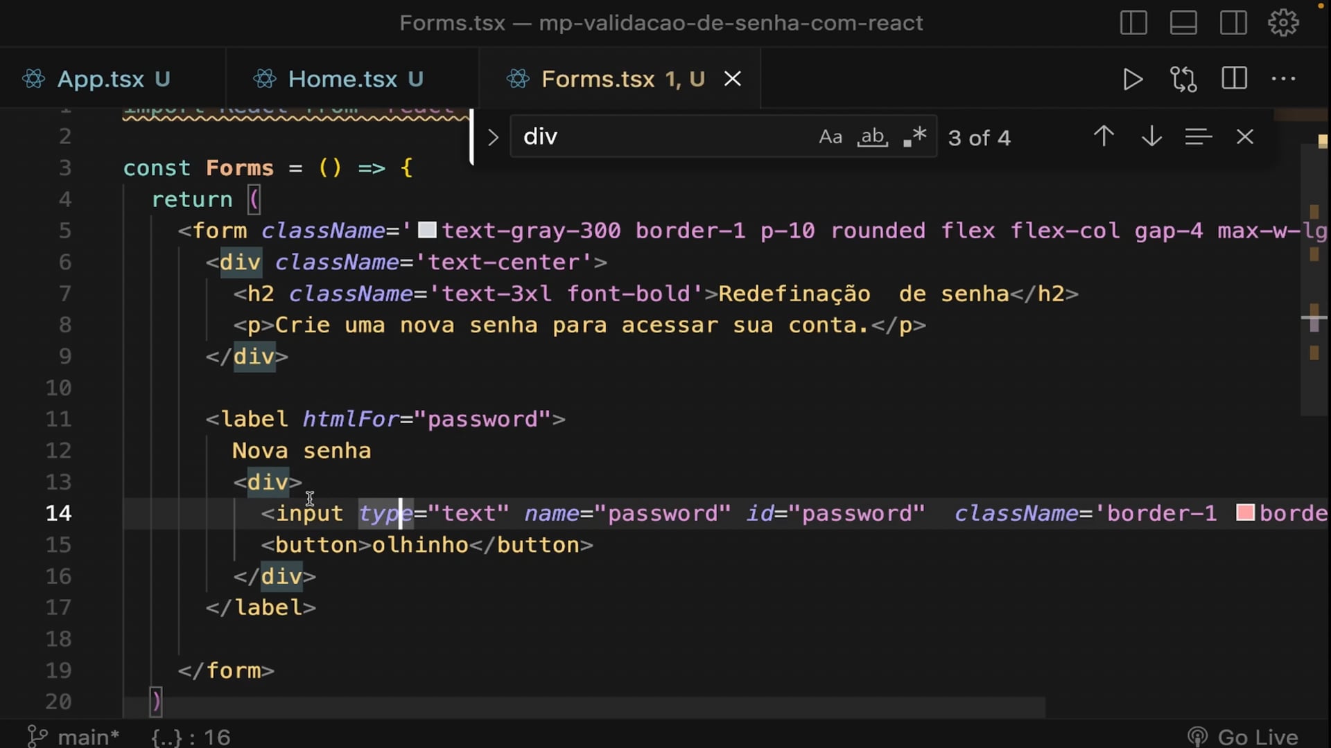 Adicionamos bordas nas divs e inputs para visualizar limites, e usamos React Icons para inserir um ícone de olho. Instalamos a biblioteca, importamos o ícone e o colocamos no botão, observando seu comportamento padrão.
