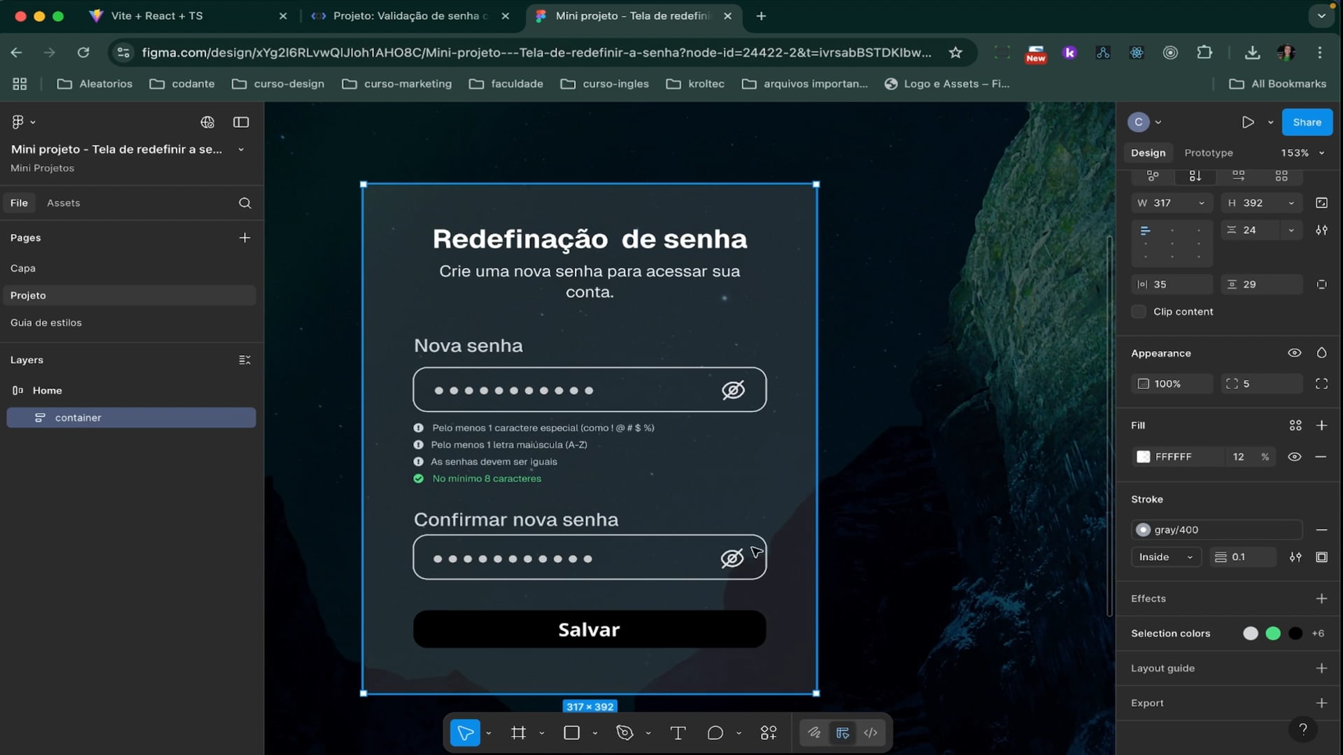 Estamos configurando o layout da página usando Tailwind CSS. Importamos uma imagem de fundo e ajustamos suas propriedades para não se repetir e ficar centralizada. Em seguida, começamos a estruturar o formulário de redefinição de senha, dividindo-o em seções para redefinir a senha, mostrar regras e incluir o botão de confirmação.