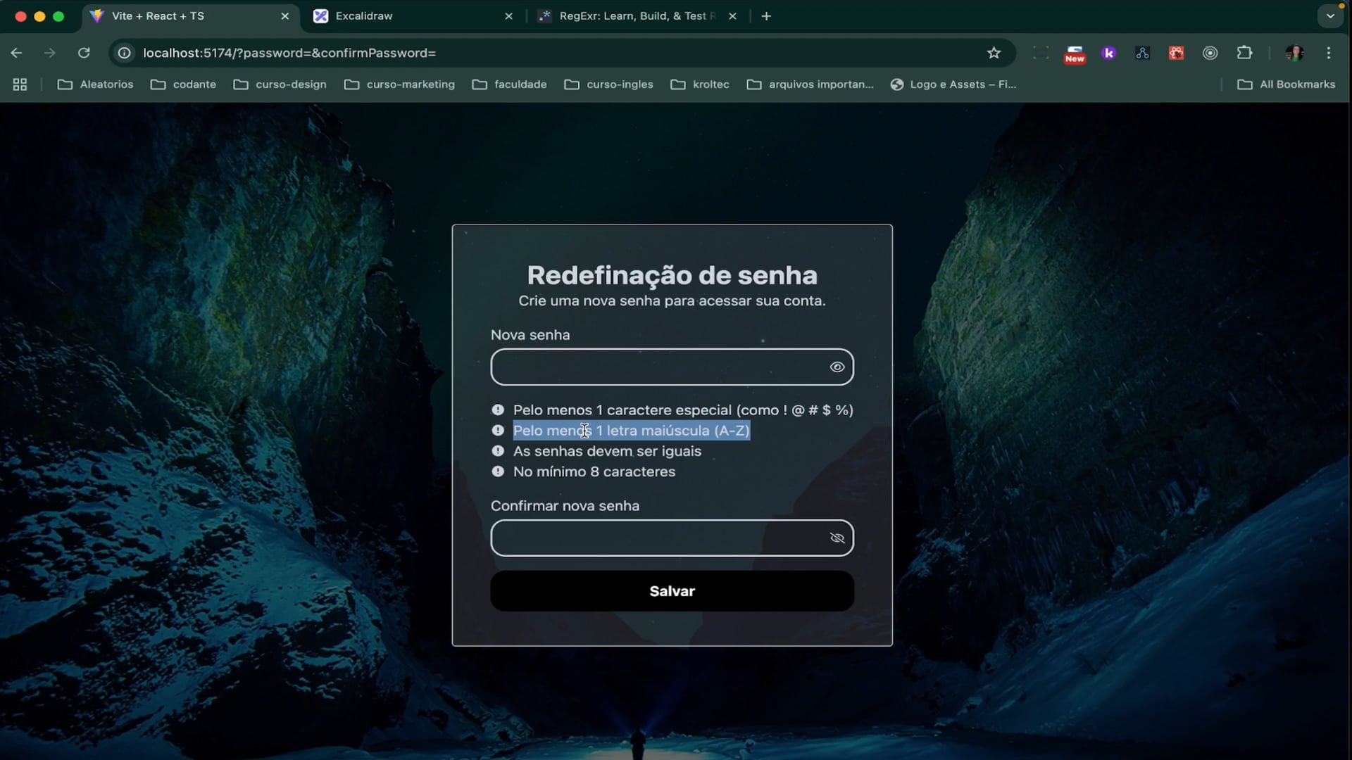 Desenvolvemos a lógica para validar a presença de pelo menos uma letra maiúscula na senha com regex. Também implementamos a validação para confirmar senhas iguais usando `useState` e `useEffect`, ajustando atualizações visuais.