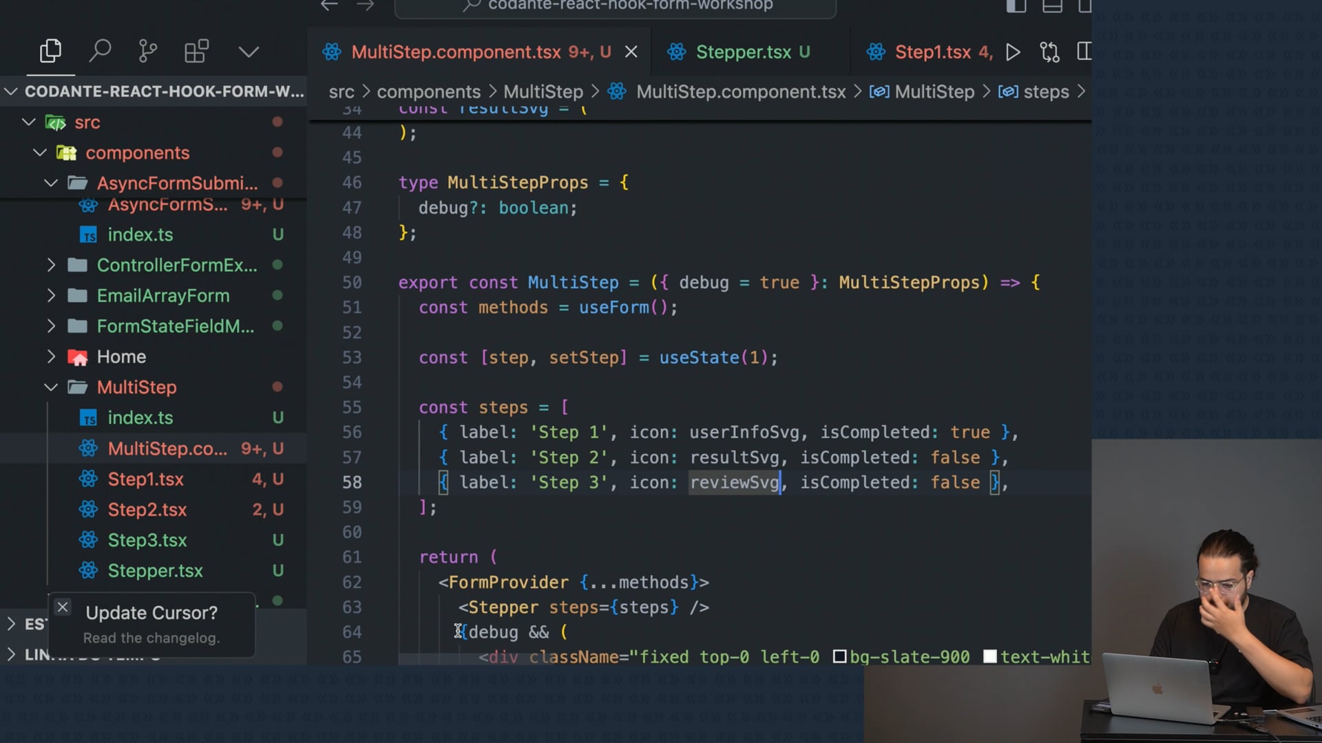 Neste vídeo, ajustamos um formulário multistep para melhorar a navegação visual, integrando um stepper e removendo ícones indesejados para identificar claramente cada etapa. Corrigimos alinhamentos e discutimos o funcionamento correto com React Hook Form.