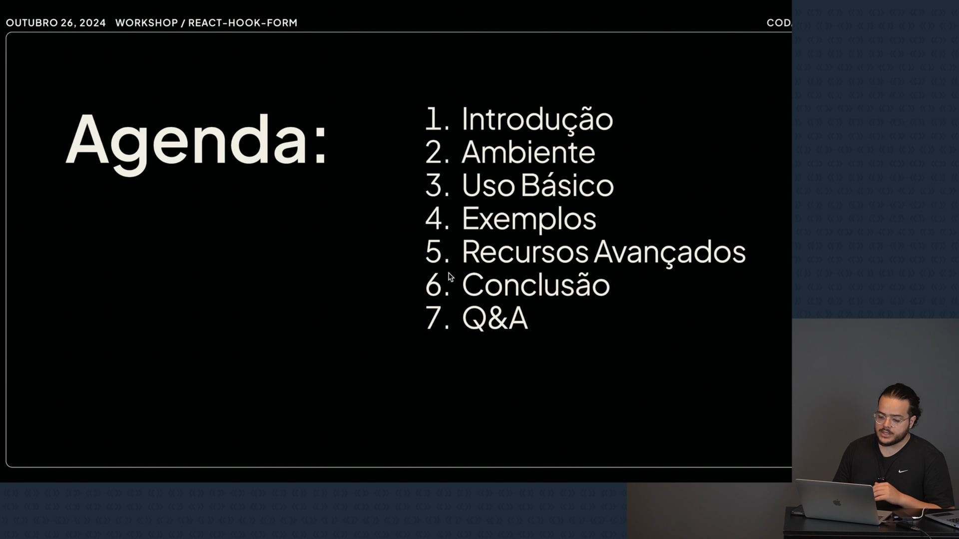 Hoje, seguiremos sete etapas: introdução ao React Hook Form, configuração do ambiente, uso básico, exemplos de validação, recursos avançados, conclusão e, finalmente, espaço para dúvidas e discussões.