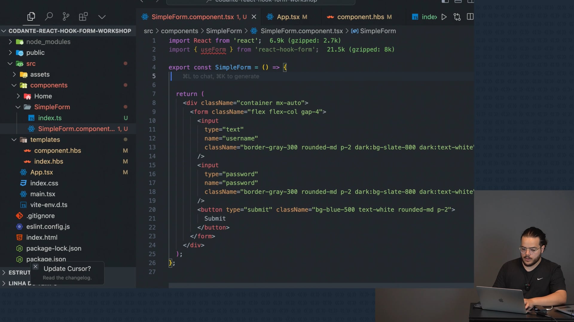 Registramos campos de um formulário com `register` do React Hook Form e lidamos com o envio usando `handleSubmit`. Explicamos como o `curry` permite passar funções sem executá-las imediatamente. Criamos um exemplo simples de formulário funcional.