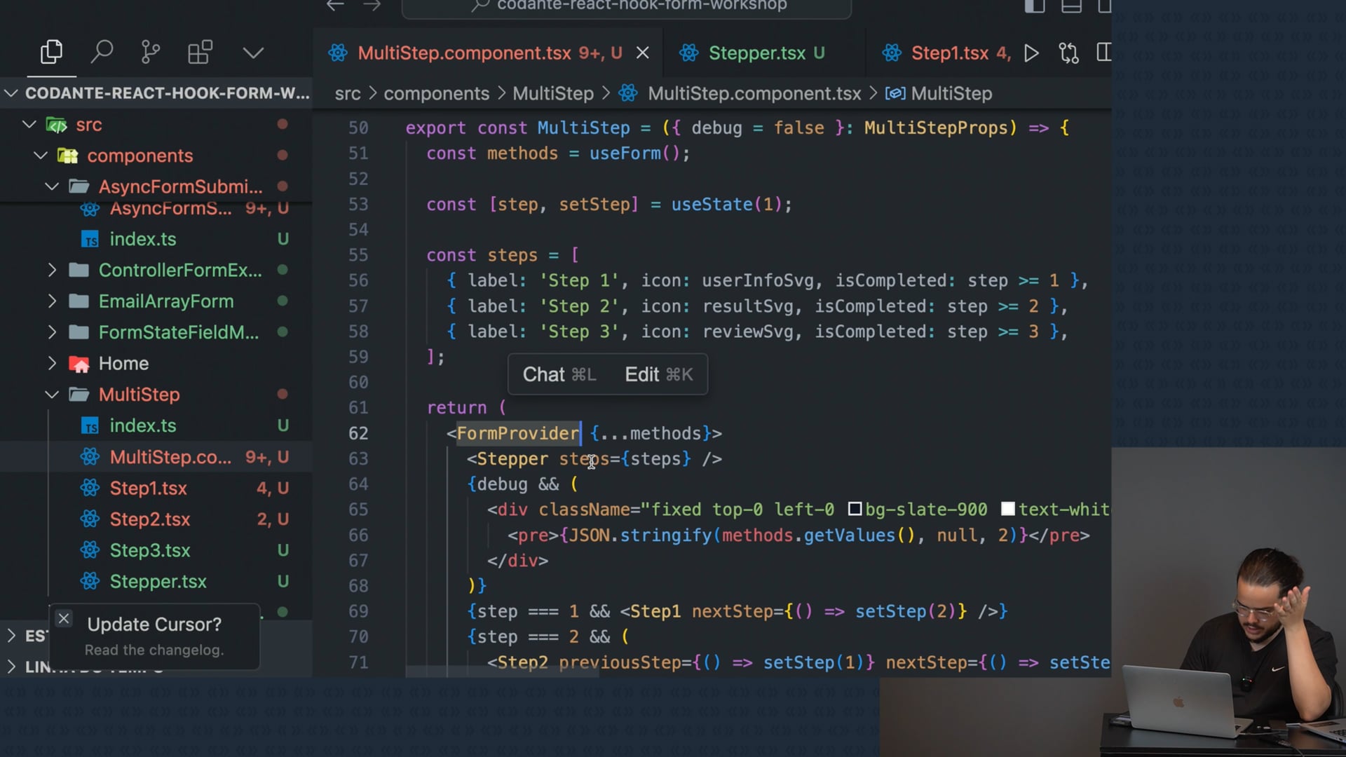 Definimos métodos do `useForm` no componente pai do formulário multistep, passando-os para o `FormProvider`. Usamos `useFormContext` nos componentes filhos para acessar e integrar esses métodos, facilitando a gestão de dados em etapas, como nome, email e endereço.