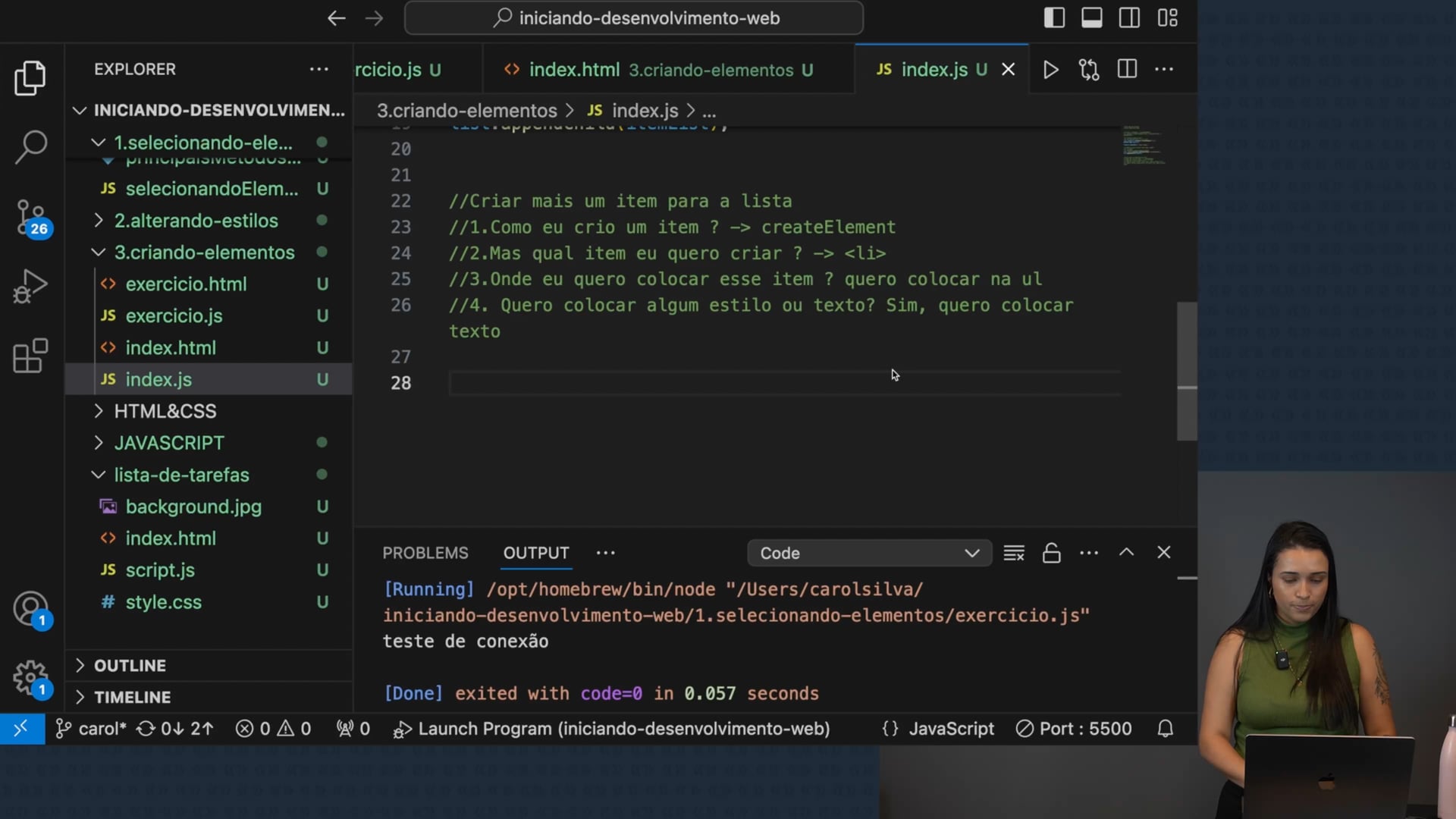 Criamos um item de lista utilizando o `createElement` para gerar um elemento `li` no DOM. Depois, inserimos texto no item utilizando a propriedade de texto. Finalmente, vinculamos esse item à lista através de `appendChild`.