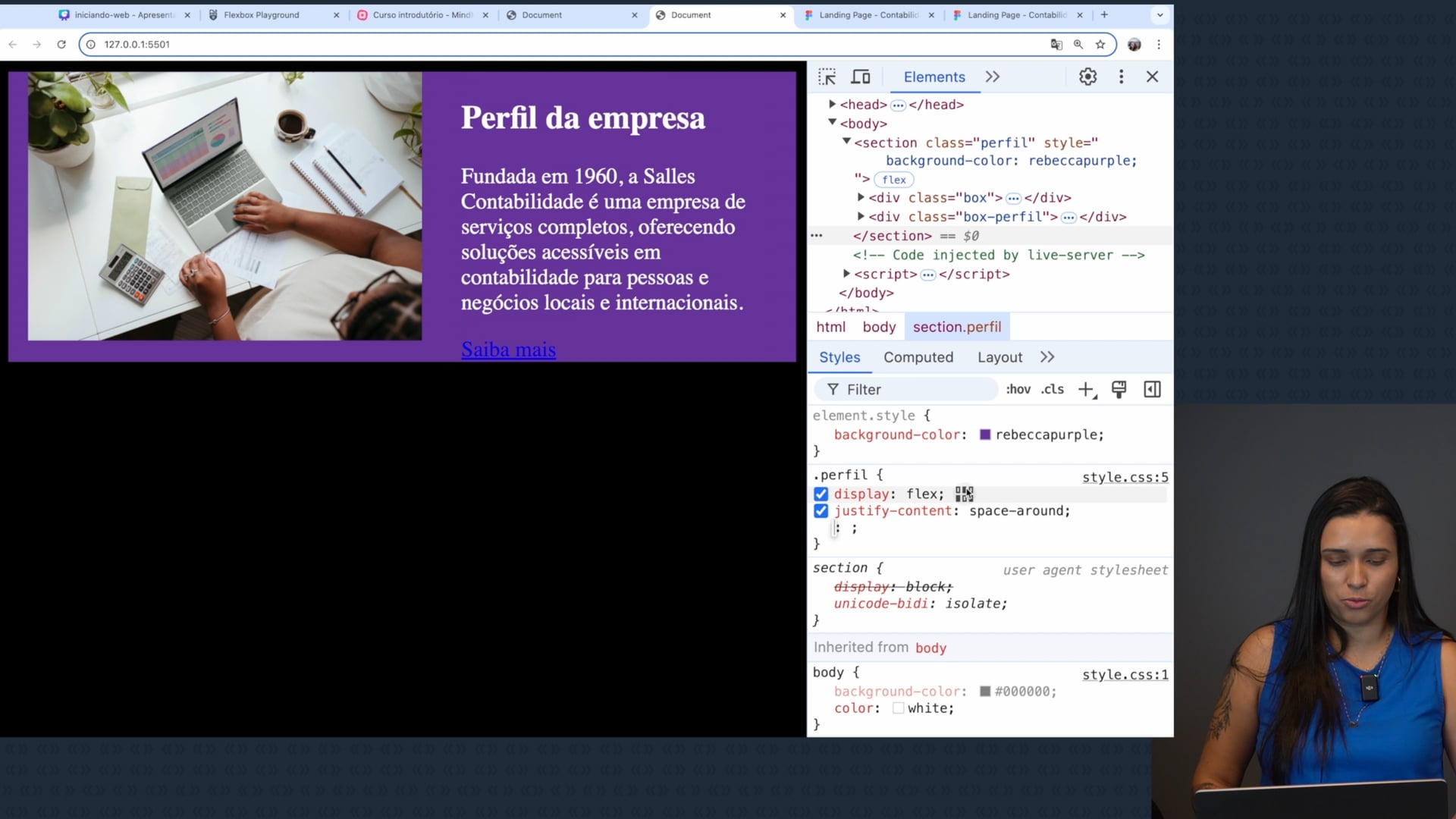 Ajustamos o box model no CSS para definir espaçamento e distribuição entre elementos, usando porcentagens para controlar a largura dos blocos e aplicando display flex para alinhamento e organização visual.