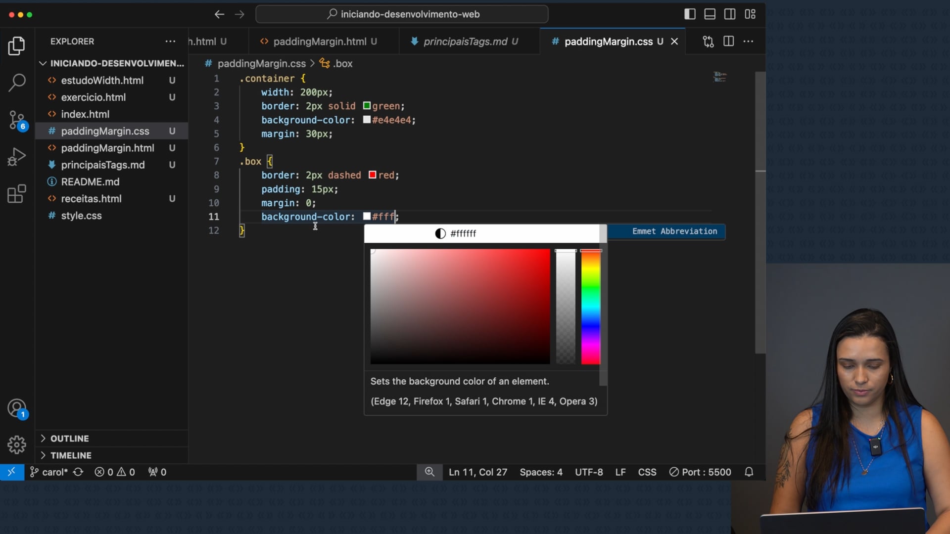 Exploramos estilos no CSS, aplicando largura, borda, e cor de fundo para containers e parágrafos. Usamos margem e padding para espaçamento, destacando herança de estilos, e aplicamos ajustes visuais flexíveis.