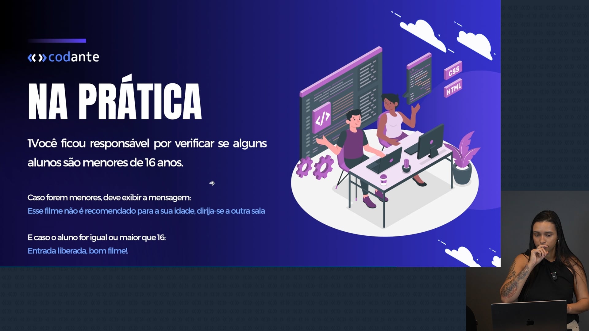 Discutimos um exercício para verificar se alunos são menores de 16 anos usando estruturas de controle. Destacamos a exibição de mensagens apropriadas, dependendo da idade. Em breve, abordaremos funções e objetos.