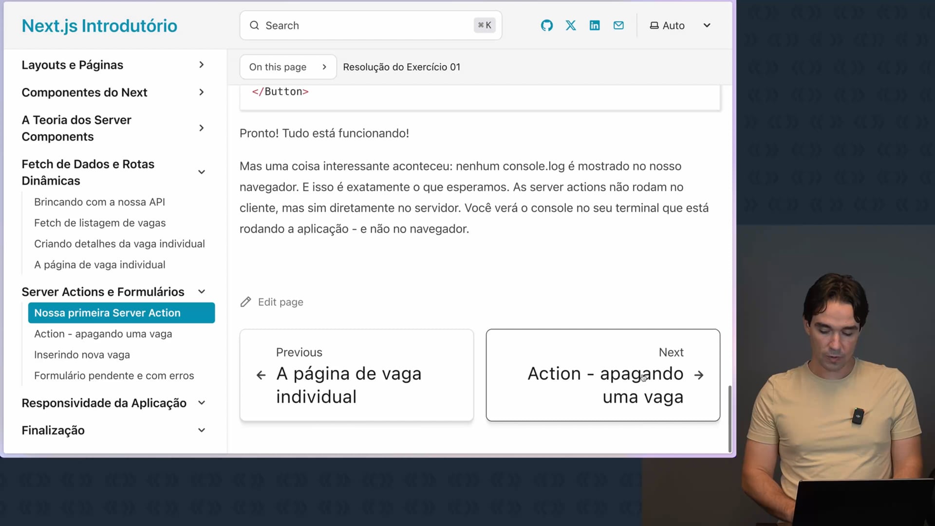 Aprenderemos a apagar a vaga da forma correta, utilizando formulários e `Server Actions`. Criaremos a função deleteJob no arquivo actions.ts e a marcaremos com UseServer. Utilizaremos um formulário com um input hidden para passar o ID da vaga e um botão para submeter o formulário. Utilizaremos a função redirect do Next Navigation para redirecionar para a página de vagas após apagar a vaga.