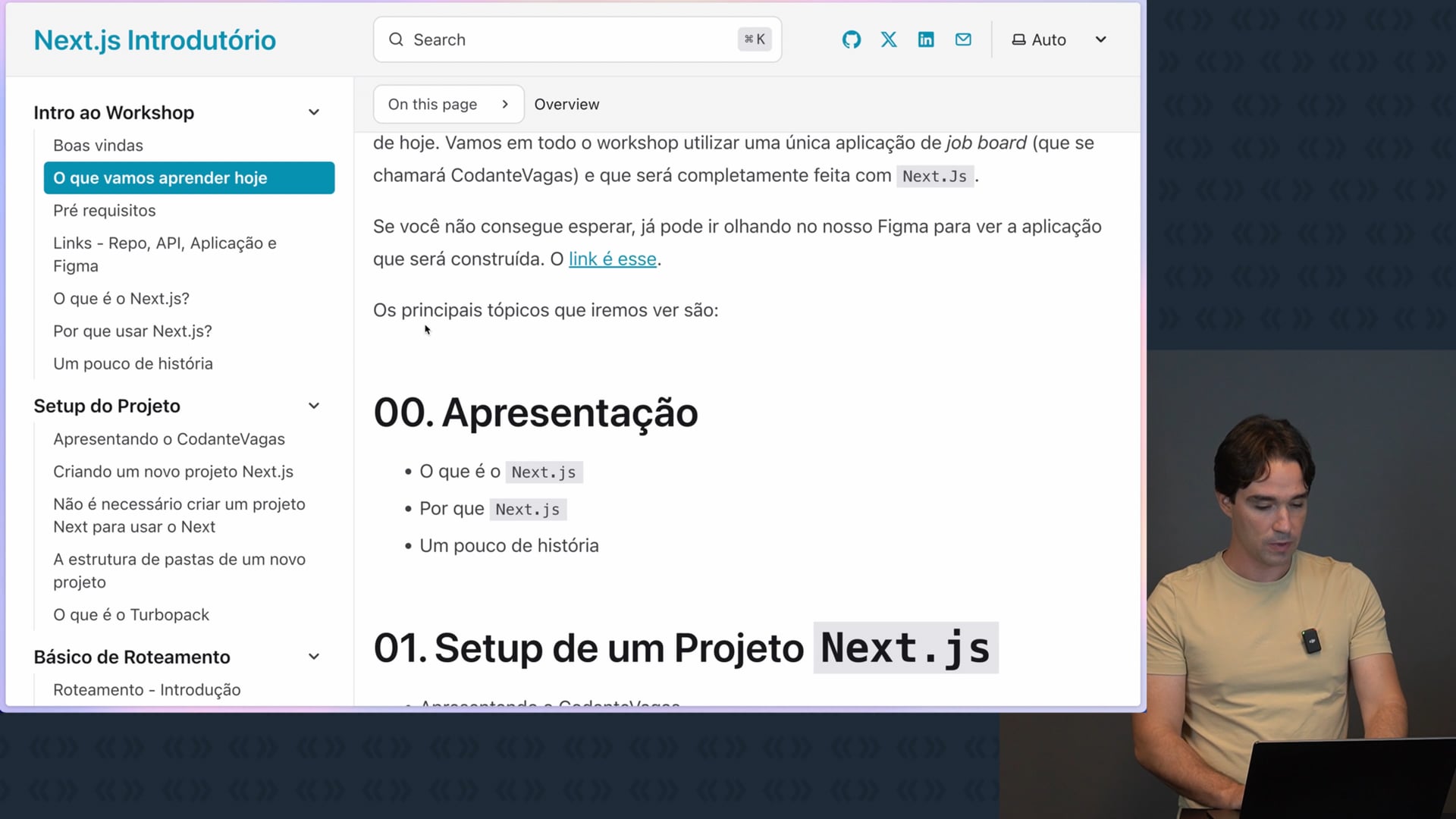 Damos as boas-vindas ao workshop de Next.js e destacamos que todos os guias e a API utilizada são open source. Apresentaremos em detalhes o conteúdo do workshop e o instrutor, Roberto Cestari, um dos fundadores do Codante, com vasta experiência em PHP e JavaScript, apaixonado pelo front-end React e pelas novas ferramentas que empoderam os desenvolvedores.
