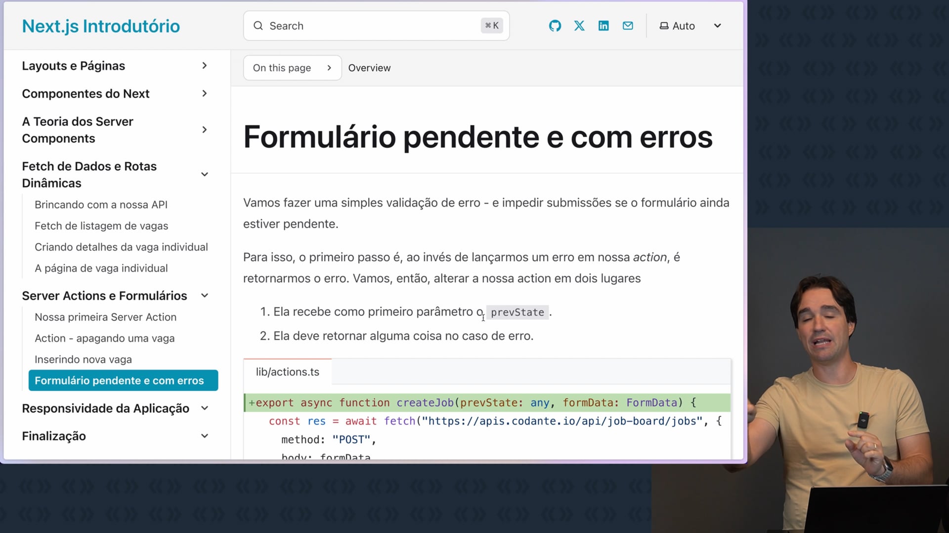 Aprenderemos a lidar com formulários pendentes e com erros utilizando o hook `Use Action State`. Explicaremos como o `Use Action State` recebe uma action e um estado inicial e retorna um estado, uma action e um estado pendente. Mostraremos como desabilitar o botão de submeter durante o estado pendente e como mostrar mensagens de erro utilizando o estado de erro.