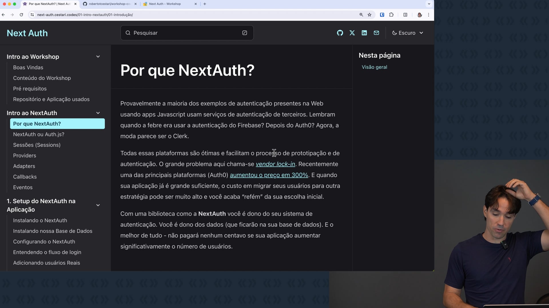 Discutimos agora o uso da biblioteca NextAuth.js para autenticação em projetos Next.js, React e JavaScript. Abordamos a dependência de serviços de terceiros e possíveis problemas que surgem a partir dela, como aumento de preços e mudanças em seus modelos de negócio. Explicamos o benefício do NextAuth.js em manter os dados de autenticação sob controle do usuário, em vez de confiar em terceiros.