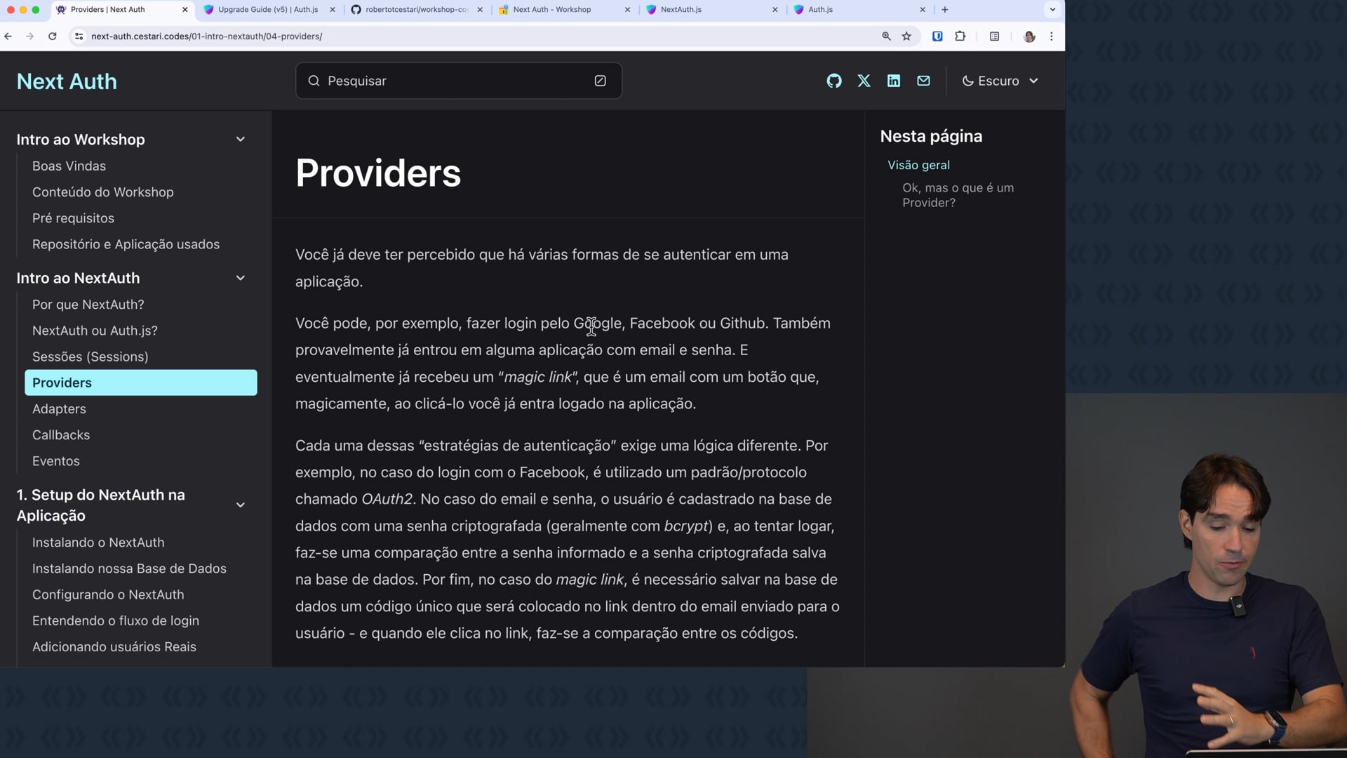 Exploramos, neste vídeo, o conceito de providers na biblioteca NextAuth.js. Explicamos como diferentes métodos de autenticação, como e-mail e senha, Magic Link e OAuth, são tratados como diferentes providers. Revisamos na documentação do NextAuth as diferentes categorias de providers e explicamos como podemos usar vários deles na mesma aplicação.
