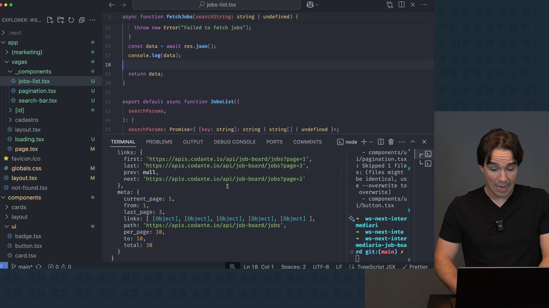 Integramos a paginação com a API, atualizando o `fetch jobs` para retornar metadados. Modificamos a função para pegar os dados e os metadados. Passamos os metadados para o componente de paginação. Utilizamos os metadados para limitar a navegação na paginação. Ajustamos o código para passar os parâmetros de paginação para a API.