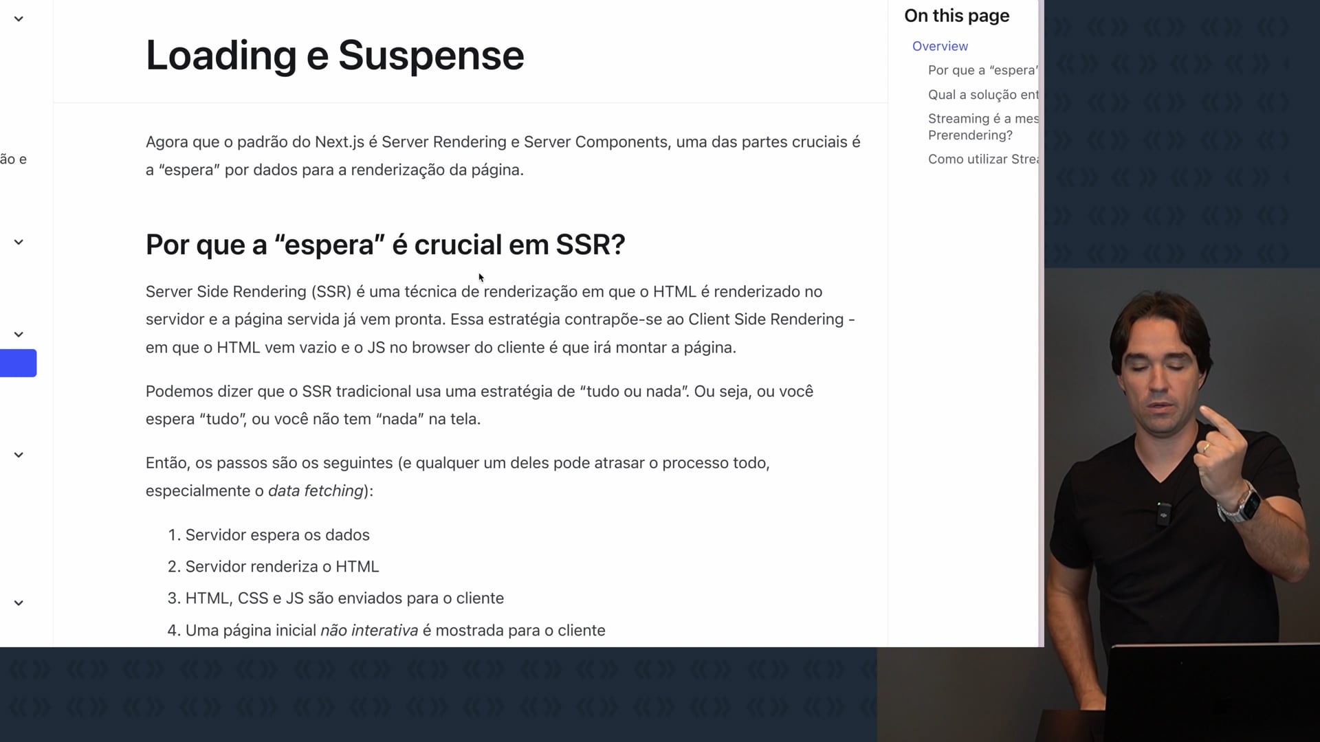 Abordamos o `SSR` (Server Side Rendering) e o processo de `hydration`. Exploramos como o `SSR` pode ser problemático quando o HTML depende de dados. Apresentamos o `suspense` e o `streaming` como soluções para melhorar a performance e a experiência do usuário. Implementamos o `loading.tsx` para usar `suspense` e `streaming` no Next.js.