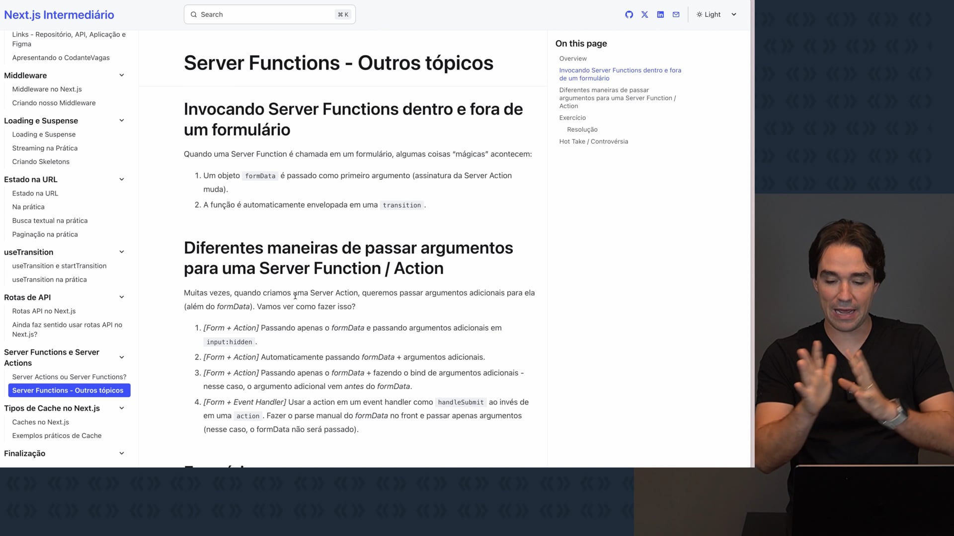 Demonstramos diferentes maneiras de passar argumentos para uma `Server Action`, como usando o `form data` com `input hidden`, passando argumentos diretamente, utilizando o `bind` e manipulando o `form data` no `event handler`. Mostramos como utilizar essas técnicas com a `Server Action` de deletar uma vaga, explorando diferentes abordagens para passar o ID da vaga.