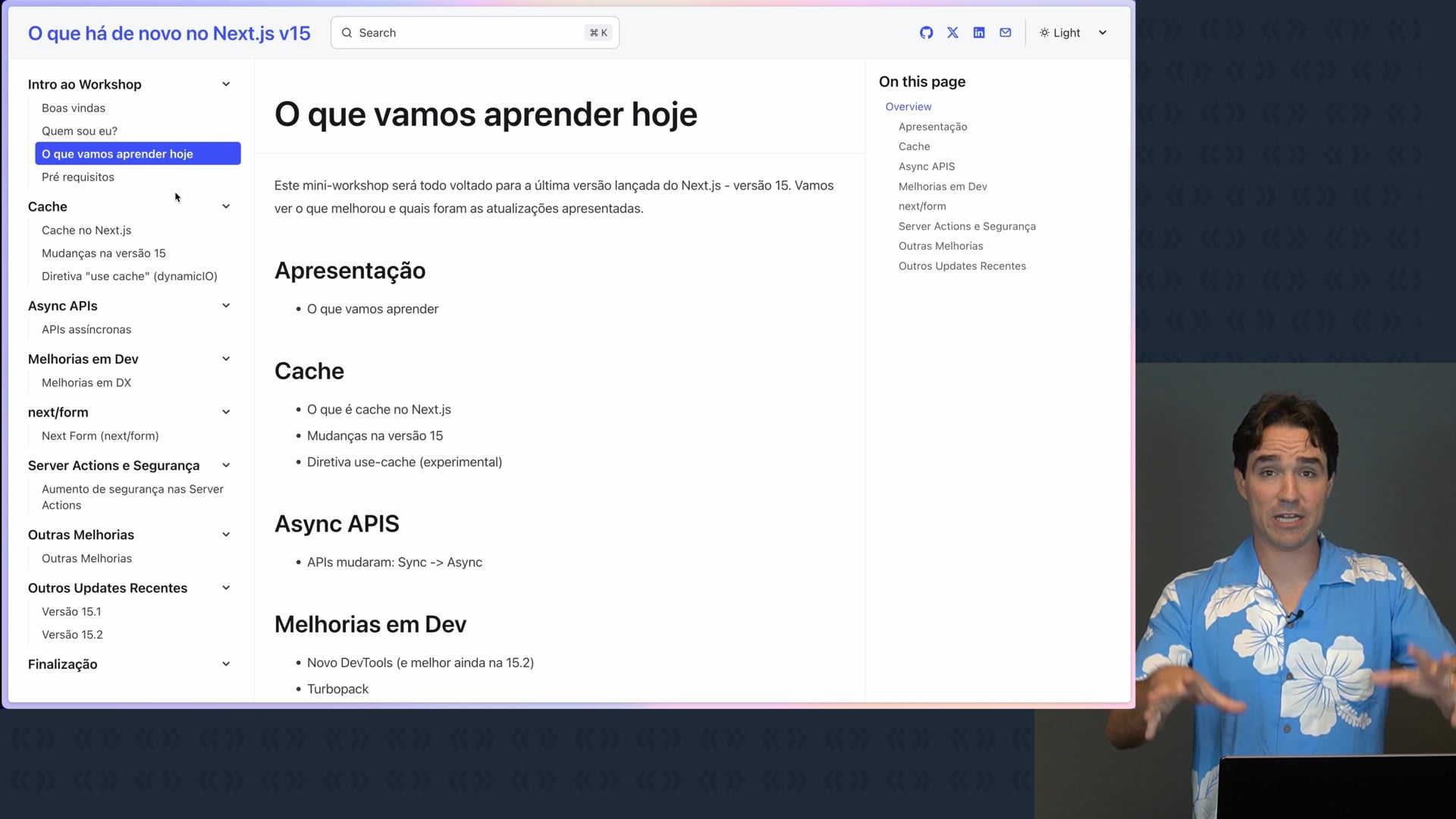 Exploramos o cronograma do workshop e discutimos como abordar o cache no Next.js, incluindo suas mudanças significativas na versão 15.