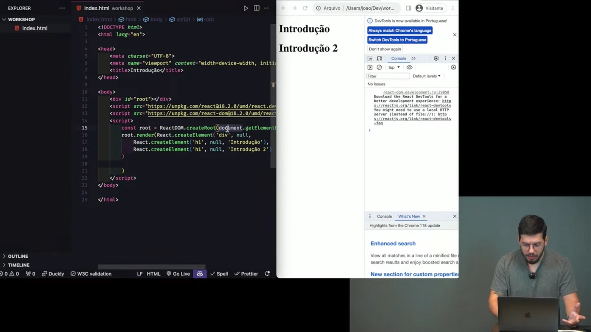 Criamos um componente `App` em React que renderiza um input de texto e atualiza uma variável `name`. Aprendemos a lidar com eventos e discutimos como o React lida com renderizações ligadas a props e estado.