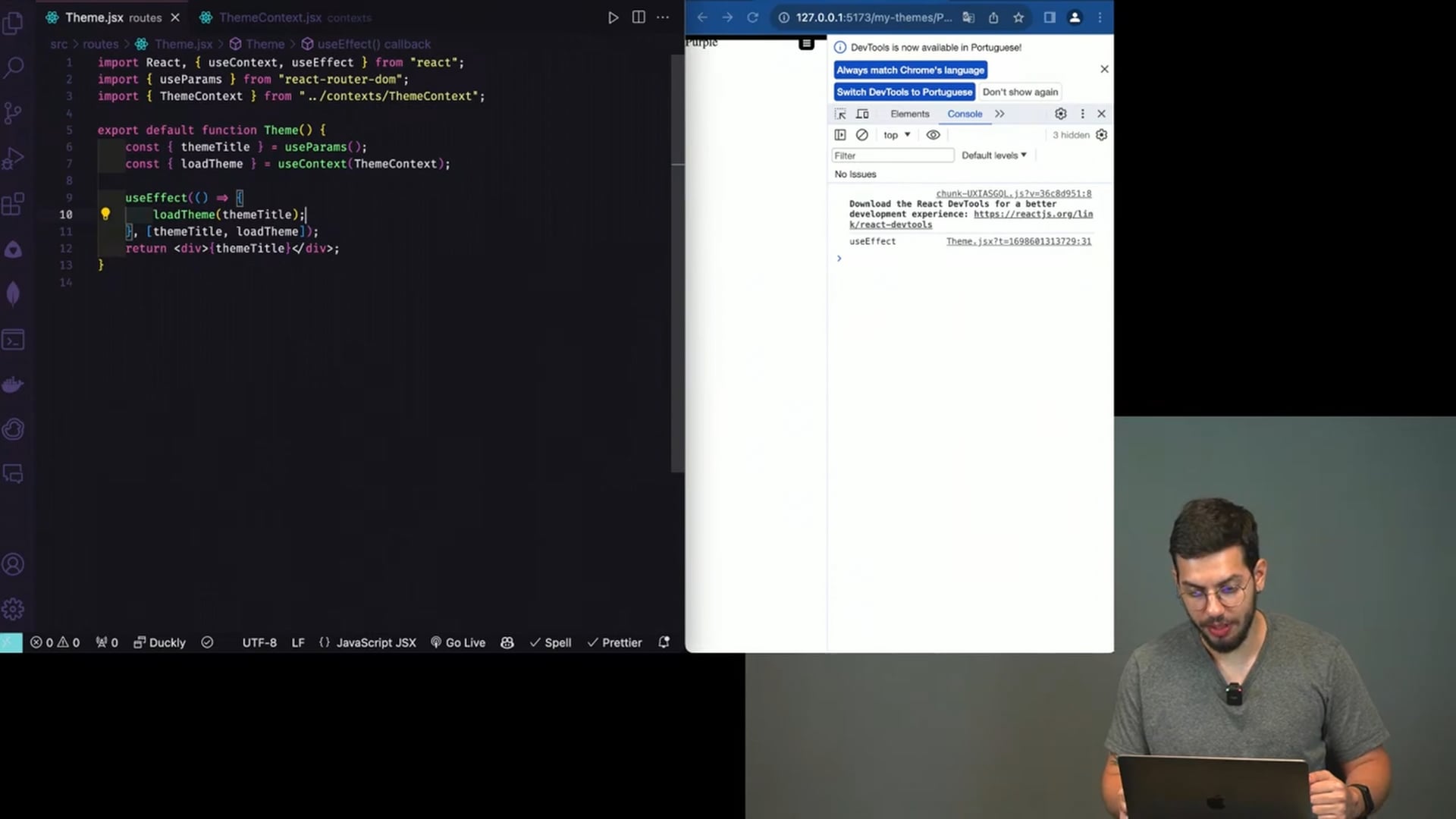 Estamos ajustando nossa aplicação React para separar componentes e rotas. Renomeamos e reposicionamos arquivos, aplicando um novo conceito de limpeza com `useEffect` e restaurando temas originais via `useCallback` dentro do contexto global.