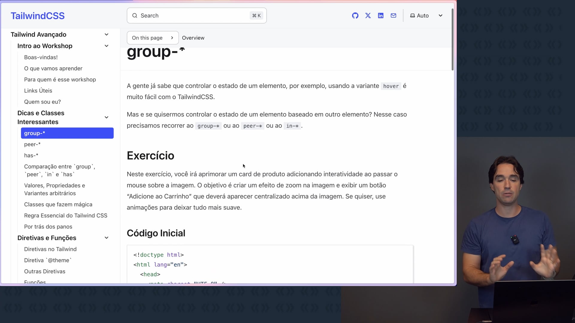 Vamos aplicar a classe `group` em um exercício, aprimorando um card de produto com animações e efeitos ao passar o mouse.