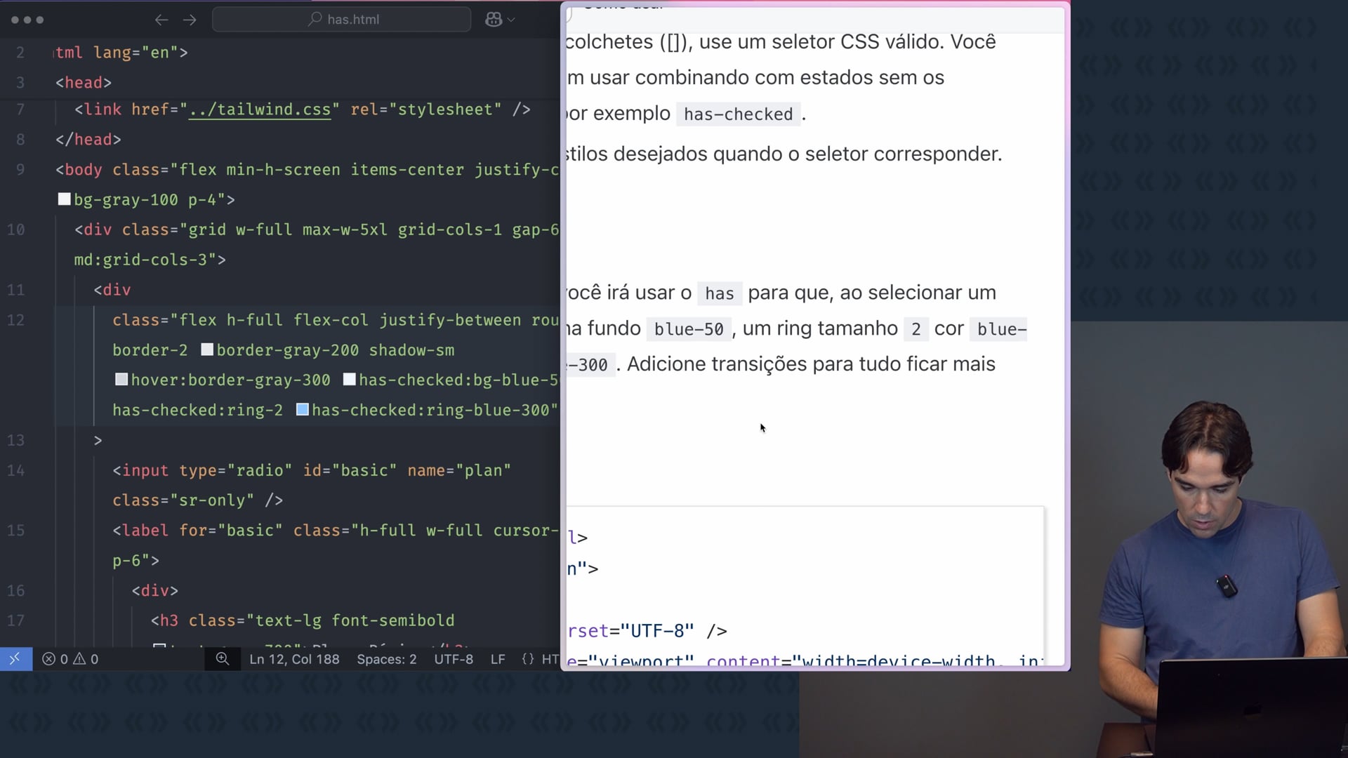 Um exercício para aplicar a classe `has` em um design de plano, realizando mudanças de estilo ao selecionar opções.