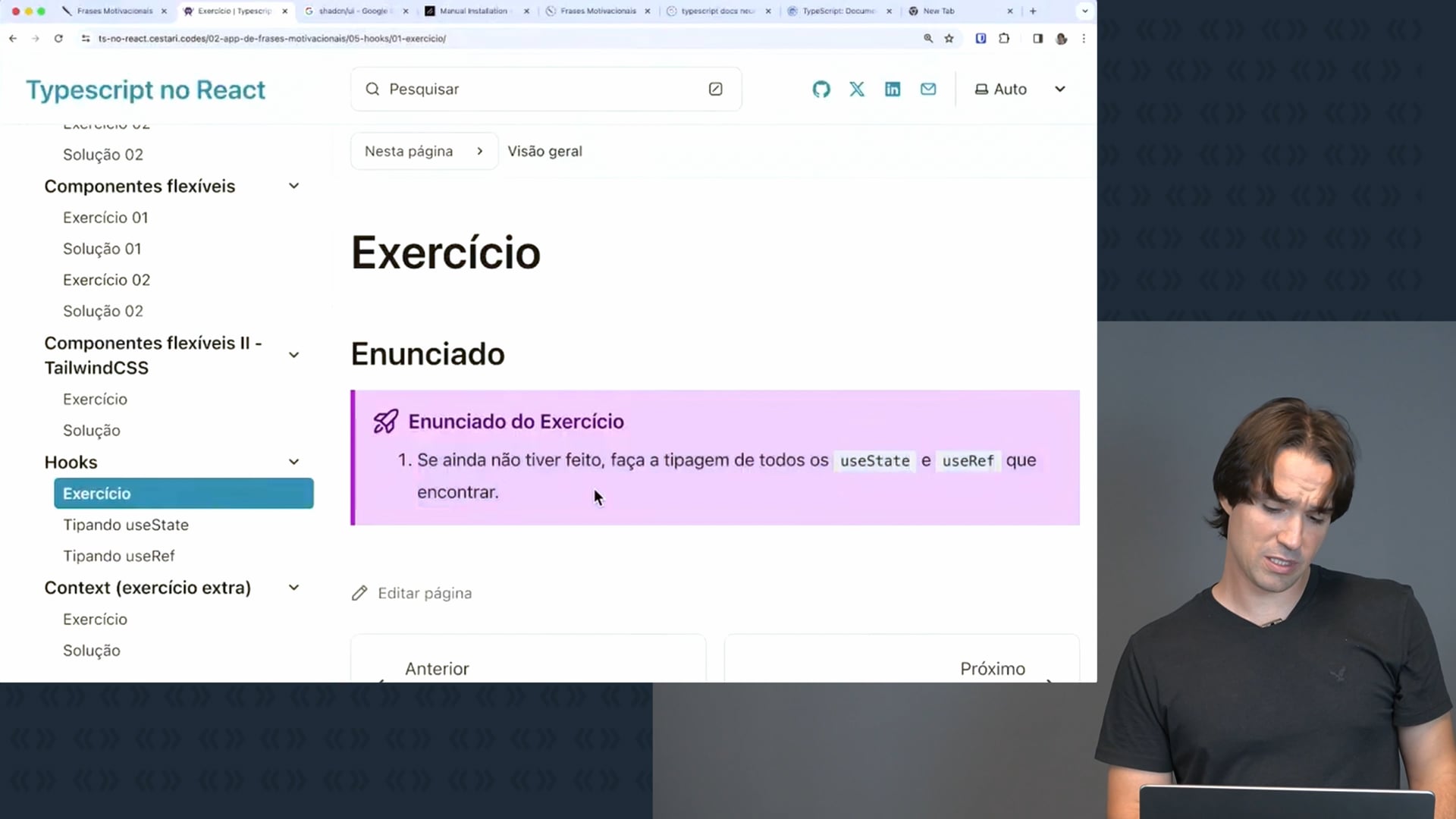 Vamos discutir a tipagem de useState e useRef em exercício de hooks. Mostramos como tipar corretamente, com exemplos práticos e explicações sobre quando é necessário fazer a tipagem. Também mencionamos a continuidade dos estudos com useRef e context.