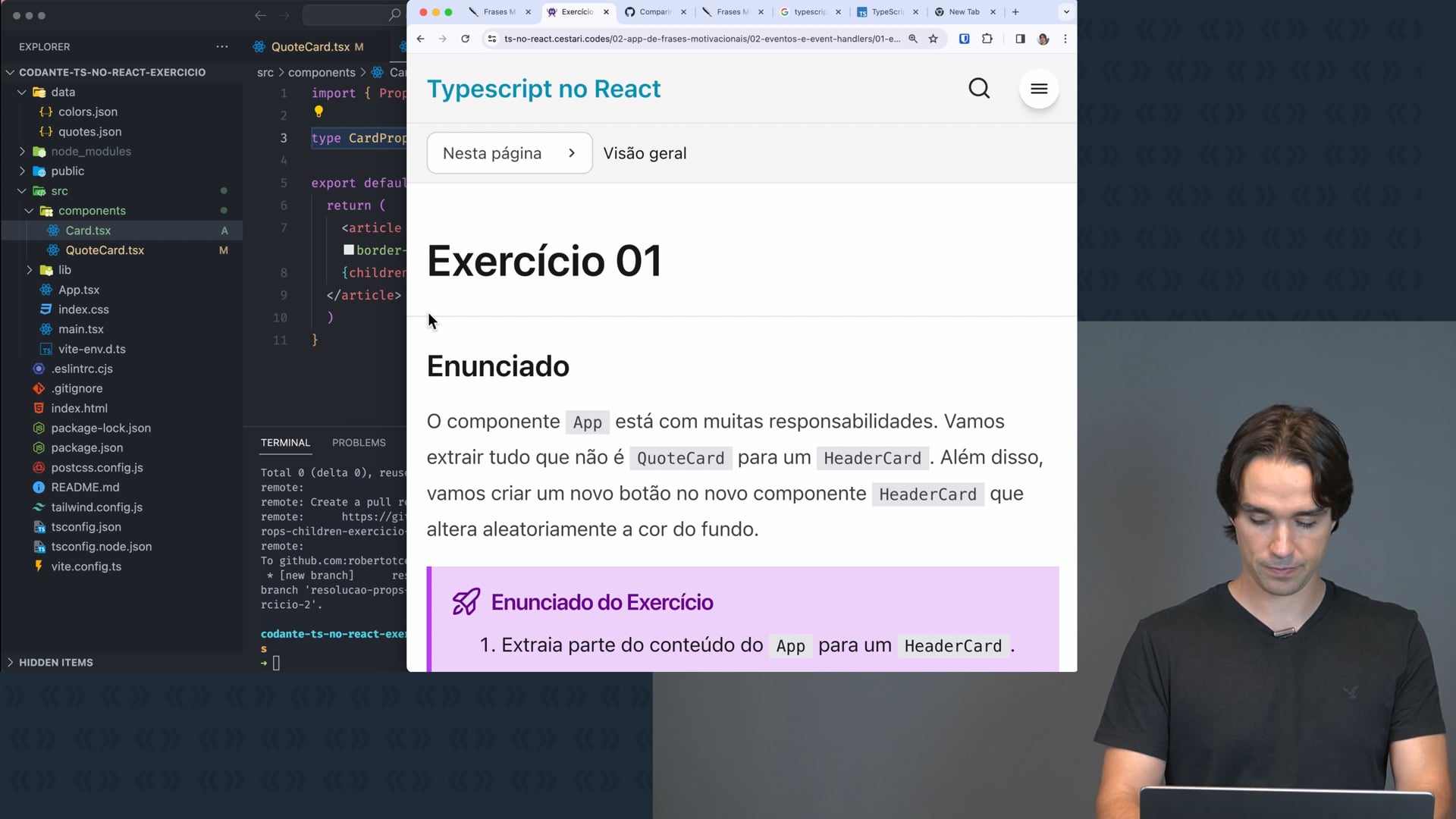 Neste exercício de Event e EventHandler, iremos refatorar o componente App para diminuir sua responsabilidade, criamos o HeaderCard e um botão para trocar a cor do fundo.