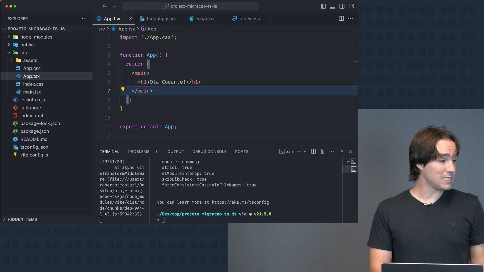 Neste trecho do vídeo, é discutida a migração de um componente JavaScript para um componente Typescript. É ressaltado que, na prática, a única diferença entre eles é a extensão do arquivo, devido à inteligência do Typescript e React.