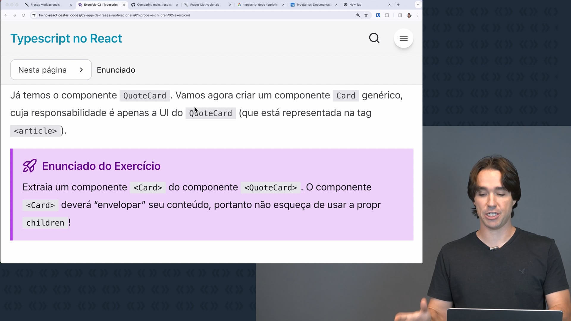 Neste vídeo, é demonstrado o processo de criação de um componente Card genérico em React. São abordadas questões de tipagem para o atributo Children, mostrando diferentes abordagens para solucionar o erro de TypeScript.