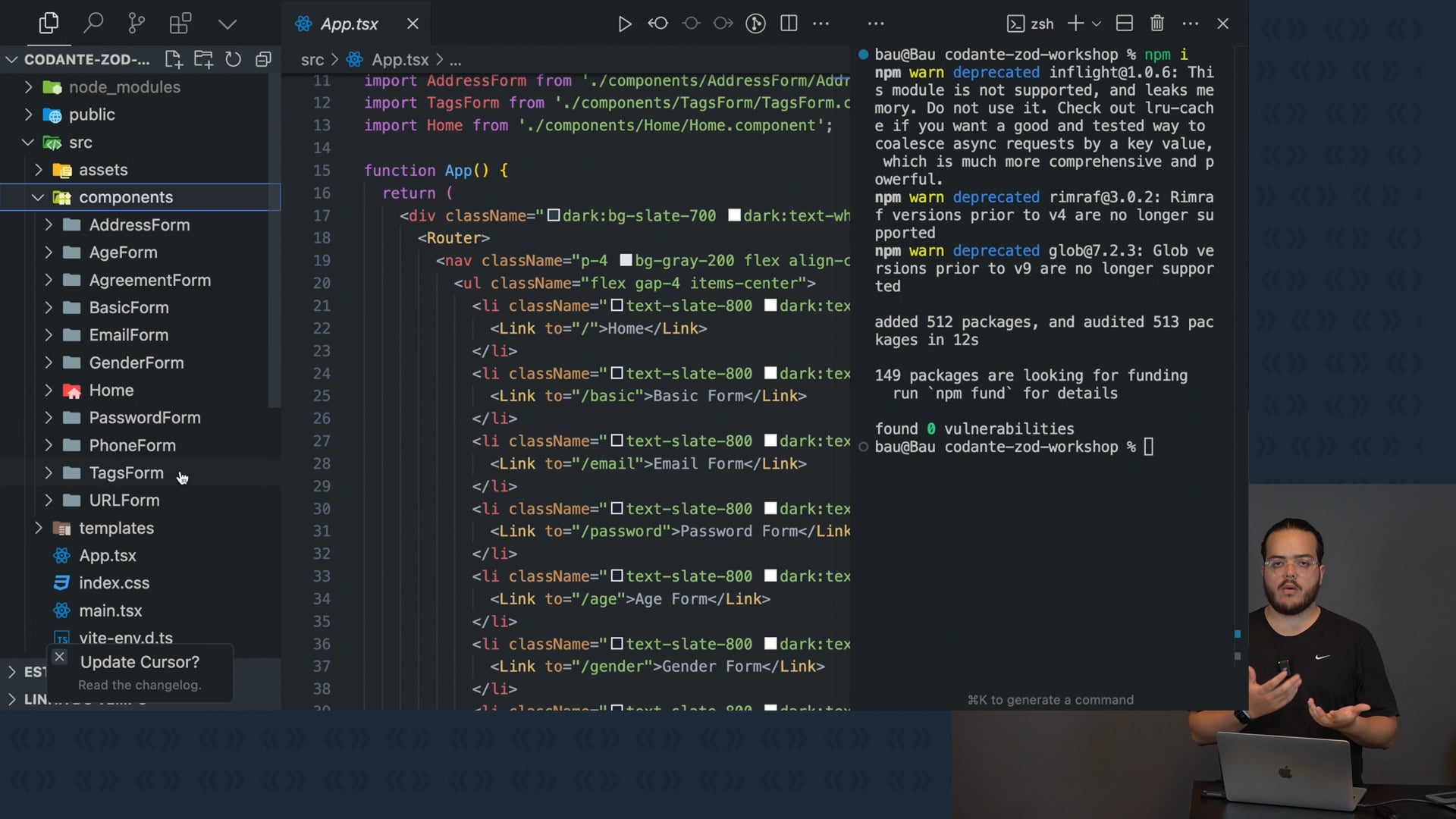 Clonamos o repositório Codante para configurar nosso ambiente de desenvolvimento usando Vite, React e React Hook Forms. Instalamos dependências e preparamos formulários para validação com o Zod, personalizando mensagens de erro. Exploramos validações mínimas e máximas para strings.