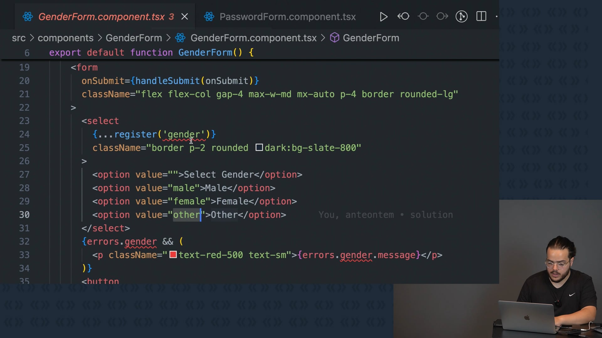 Validamos o campo `gender` com Zod, usando `z.enum` para restringir opções a `male`, `female`, `other` e `not informed`. Discutimos valores opcionais, mensagens de erro e ajustes possíveis.
