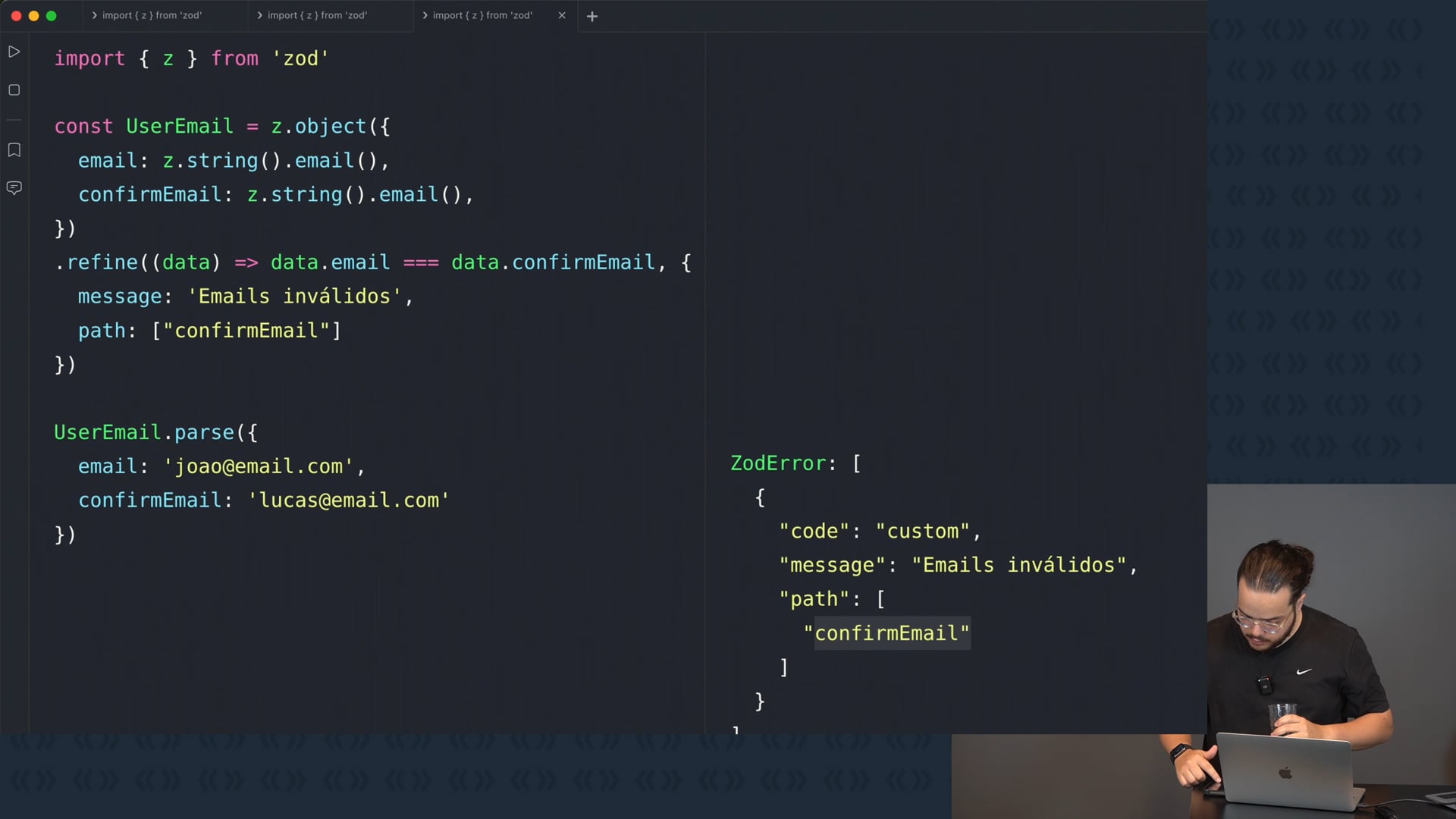 Aprendemos a validar senhas no Zod, exigindo que sejam strings de no mínimo seis caracteres e coincidam com a confirmação da senha. Exploramos a definição de tipos para os campos de senha.