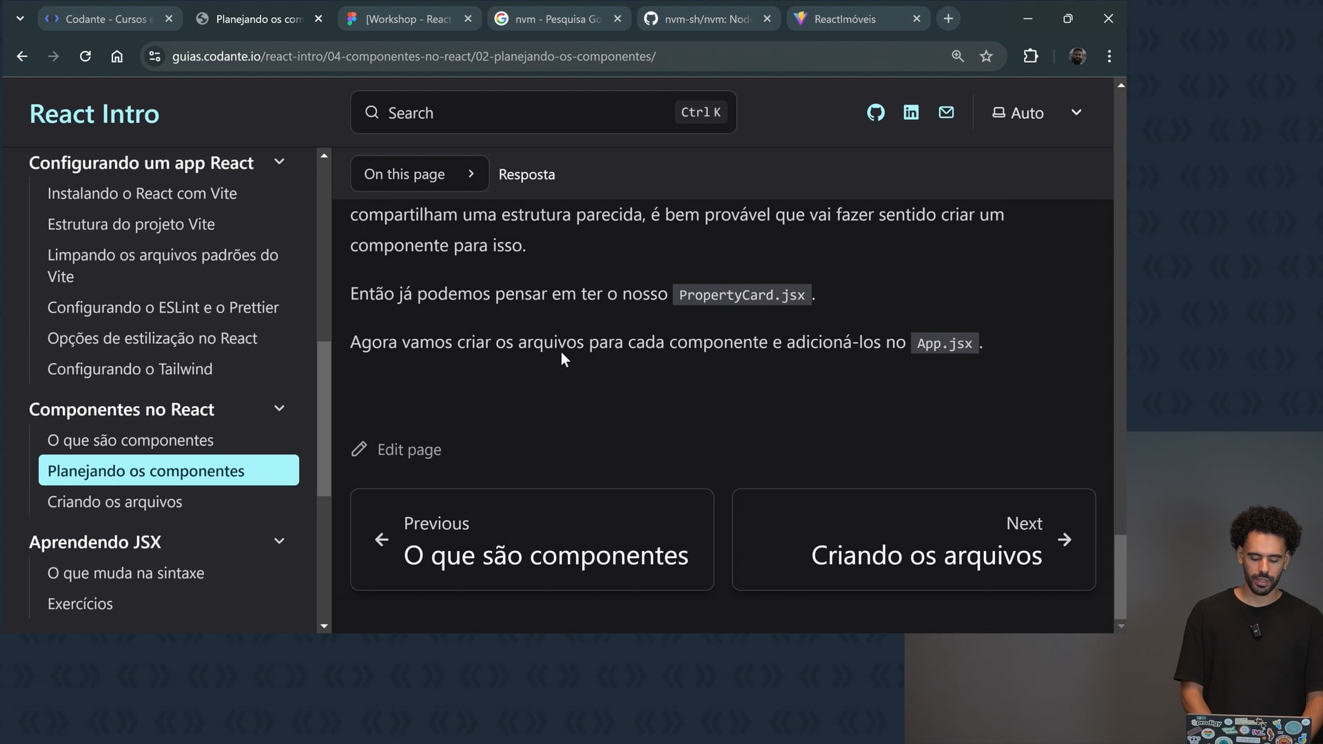 Estamos criando a estrutura da aplicação React, adicionando componentes como Navbar, Hero, Featured Properties, Contact Form e Footer. Utilizamos atalhos e auto-imports do VS Code para otimizar o processo. Corrigimos um erro de importação para garantir que todos os componentes apareçam corretamente na página.