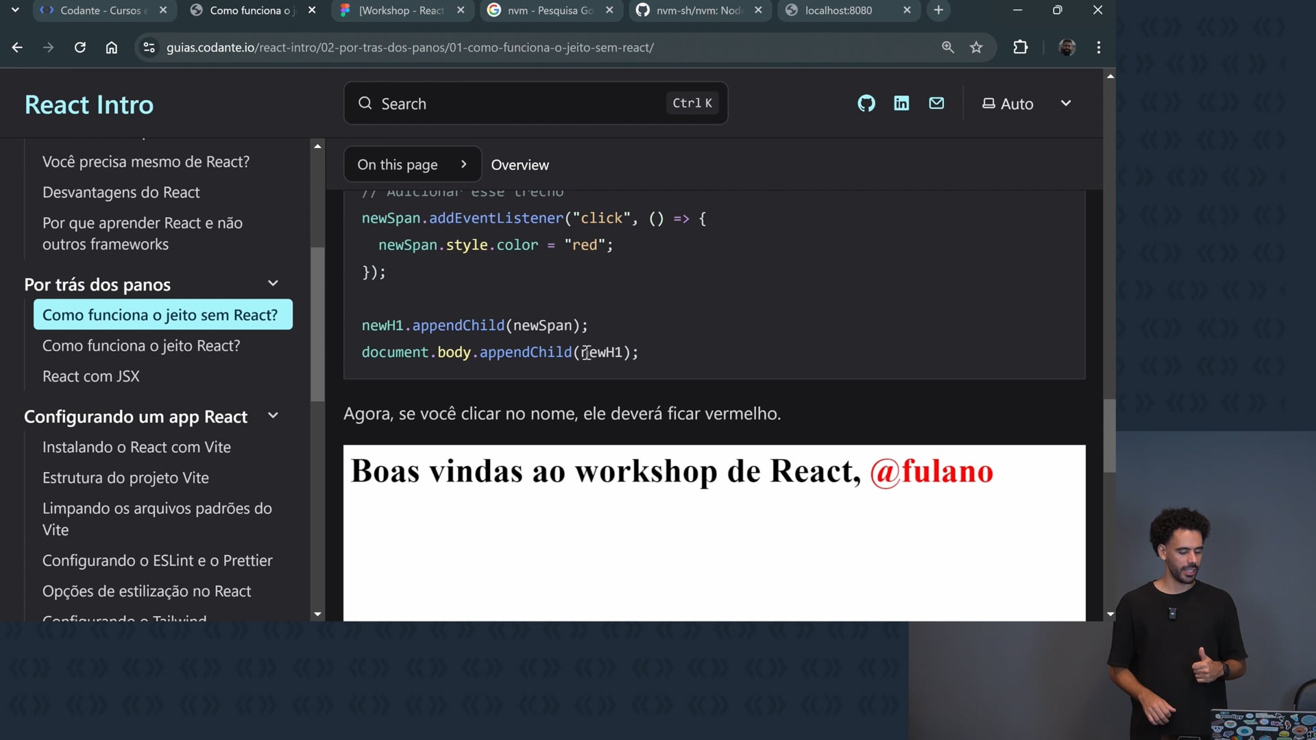 Neste trecho do workshop, aprendemos a criar elementos HTML usando React. Utilizamos `React.createElement` para definir um título H1, associando-o a uma div com ID `root` usando `ReactDOM.createRoot`. Exploramos a relação entre `React` e `ReactDOM`.