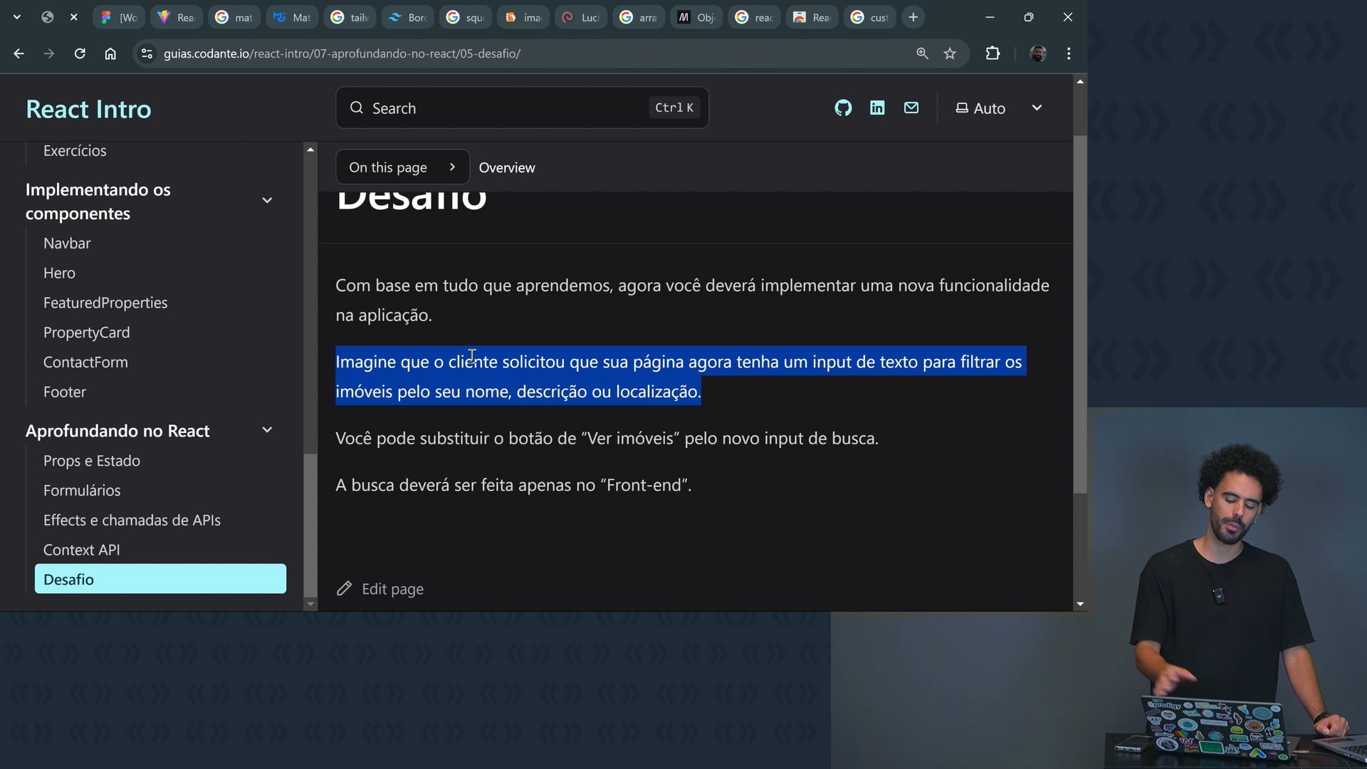 Vamos implementar um filtro em nosso site de imóveis, substituindo o botão por um campo de texto. Esse filtro, feito no front-end, pesquisará por nome, descrição ou localização dos imóveis usando nosso provider recém-criado.
