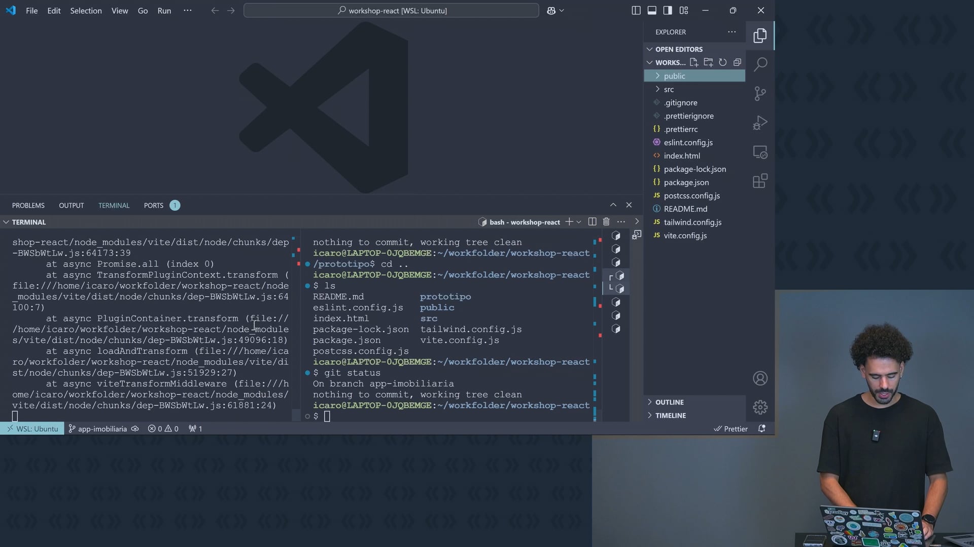 Revisamos a estrutura de pastas do projeto, iniciando pelos componentes. Corrigimos problemas com dependências usando `npm install` e verificamos a aplicação rodando no navegador, preparada para implementar funcionalidades.