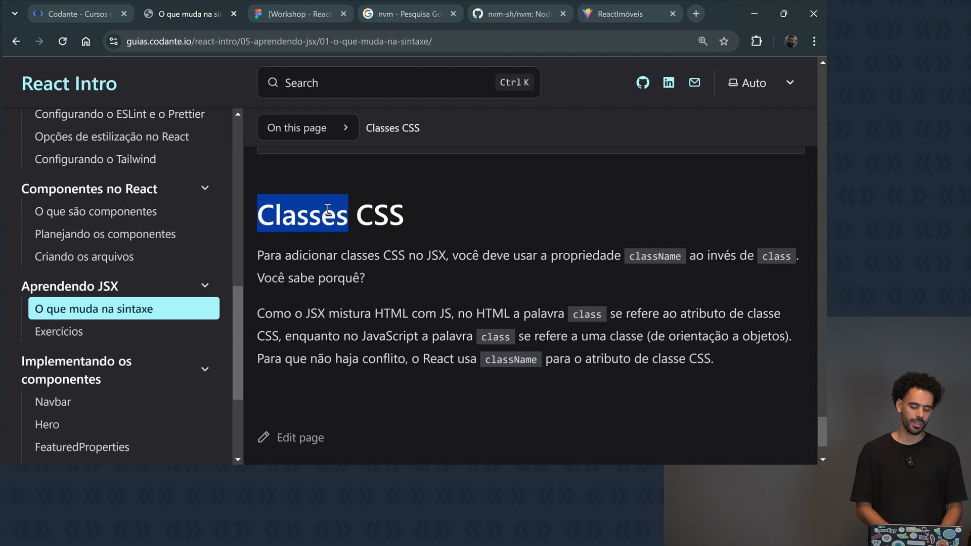 Vamos resolver exercícios de JSX focando em renderização condicional com operadores ternários. Testamos diferentes estados para o componente Navbar, verificando se `Faça login` ou `Bem-vindo, usuário` é exibido corretamente.